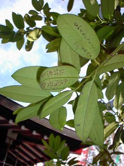 | 地元の人たちは、紙の無かった時代からタラヨウの葉の裏にこのように書き込みました。 ここに書かれているのは一年前の物ですが、くっきりと文字が残っています。 |